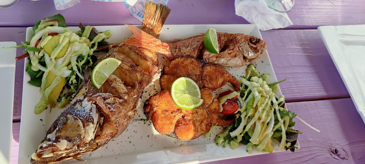 Nice and relaxing place for dinner. Waiting staff is very friendly. Person behind the cash register not so much. Tables are picknick tables positioned over the beach. Not much shade around so come prepared for that. Prices are quite okay. We went for the fish platter for two. Nice variety of fish. Taste was good, but not extraordinary. Smoothies are nice. Card payments possible. Sea not very suitable for swimming but for the views okay. There's a little bit adventurous wooden bridge crossing a small river next to this restaurant where our kids enjoyed playing while waiting for the food to be prepared. The online reservation didn't work when I tried. Plenty of free parking available.