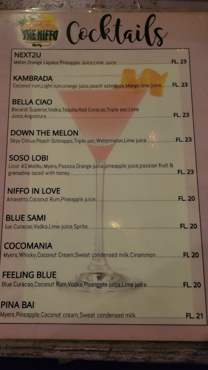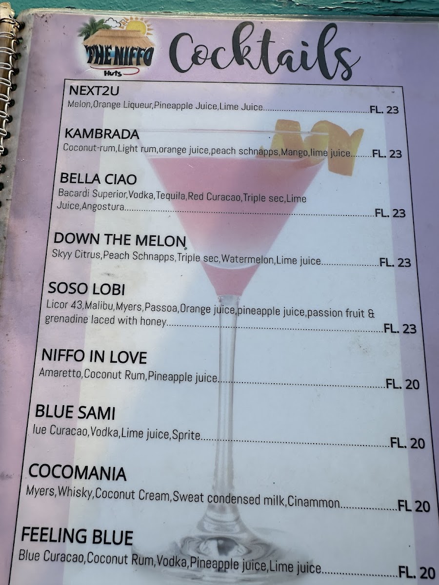 Drinks at The Niffo Huts include a range of tropical cocktails—mojitos, piña coladas, and more—alongside refreshing non-alcoholic options like cranberry juice. These pairs well with the food and the stunning sunsets, making it a favored spot for unwinding after a day of exploring. Whether stopping by for a casual dinner or a laid-back evening with friends, the menu balances approachable flavors with the easy-going charm of Curaçao’s coast.